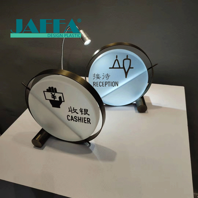 JAFFA Acrylic Small Signage es un producto diseñado a medida para la orientación espacial y la visualización de la marca, diseñado para espacios comerciales, hoteles, oficinas y entornos minoristas.Fabricados a partir de paneles acrílicos de alta pureza mediante grabado con láser, impresión UV y retroiluminación LED, creamos pequeños letreros refinados y reconocibles ideales para números de habitación, indicadores de función, placas de autorización, letreros de cajero / recepción, y más.